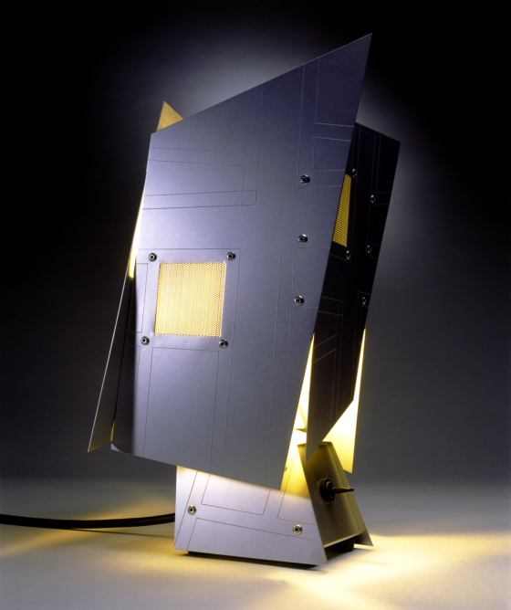 Each table light incorporated an assortment of irregular, geometric pieces of recycled metals. Since the lamps were made from only found objects with re-conditioned light fittings, they were especially unique and unlike anything people had seen at the time. Containing a bulb whose glow could be seen on all sides of the fixture, the limited edition lamp designs showed off Homicki’s ability to direct illumination using an original piece of early “green-friendly” art. In fact, they were so far ahead of their time that they won an eco-design competition in Sydney, Australia back in 1995 for Homicki’s use of reclaimed materials.