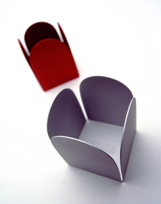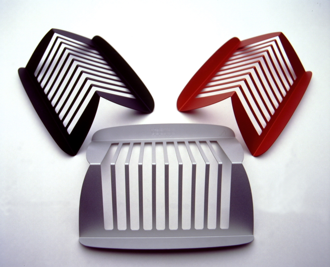 Never a dull moment in the world of dahdah, the three year period between 1997 and 2000 capitalized on the beauty of engineered aluminum. Homicki was tasked with a collection of sleek officewares for David Jones – business card holders, document trays, bookends and compact disc holders to name a few– that set itself apart as contemporary selection of pieces that were “punched and stamped in a way to allow folding”. Perhaps reminiscent of his earlier Dadaistic approach to design while at the Royal Institute of Technology at Melbourne, Homicki’s officewares found an international spotlight in the markets of Germany and France as well.