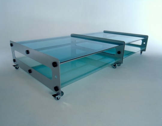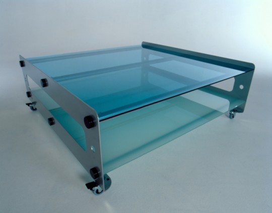 Even through the most difficult point in his design career, Homicki stayed authentic to what he knew. In fact, he came up with a glass coffee table design for a number of banks that came in blue or green laminated glass. Resting low to the ground, they were interchangeable and could link together to form a longer, modular coffee table.